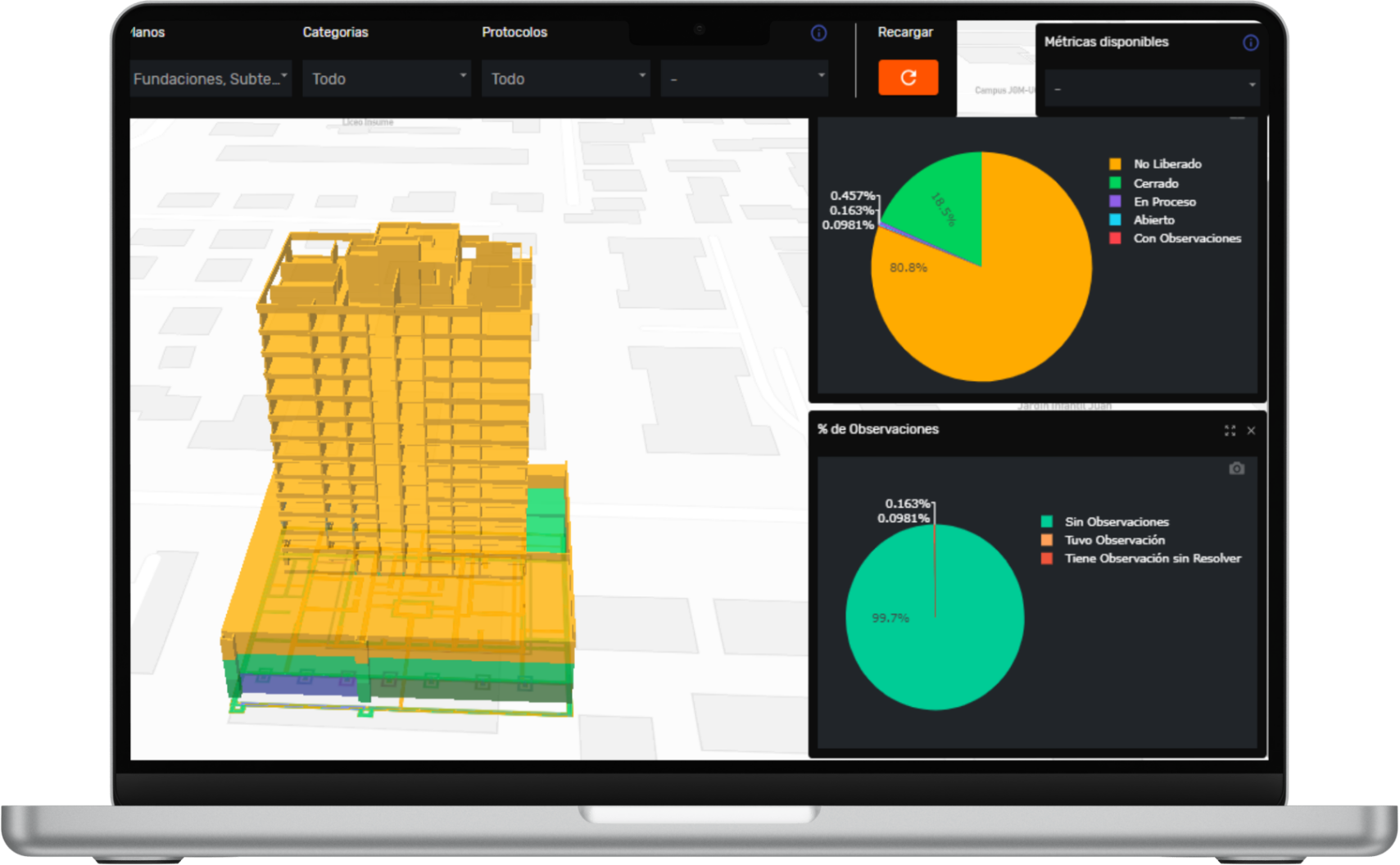 OnStageObra te ofrece una plataforma que selecciona y agrupa los protocolos de calidad y envíalos a revisar en terreno usando nuestra plataforma de escritorio. Monitorea tu proyecto en tiempo real y accede a métricas que nadie más en la industria puede lograr. Todo esto en base a un modelo 3D que permite una mejor compresión del avance estado de cada protocolo de calidad de tu proyecto.